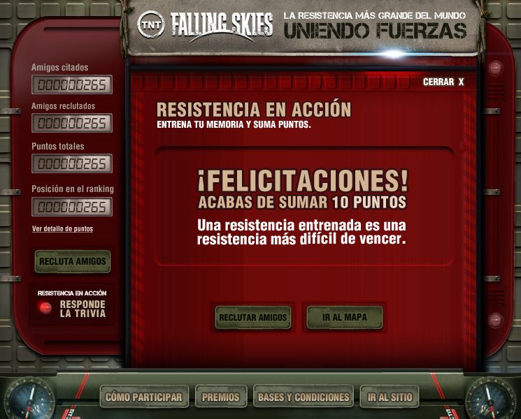Luego del éxito de la primera acción de Falling Skies y para mantener la fidelidad de los usuarios con la serie, se creó una segunda acción viral/promocional: lograr formar la Resistencia más grande del mundo contra el posible ataque de los aliens. Con este objetivo, los usuarios debían crear redes de amigos; quien más amigos lograba unir, tenía mayores chances de ganar. En la aplicación puede verse el mapa del mundo y la ubicación de las resistencias en él.